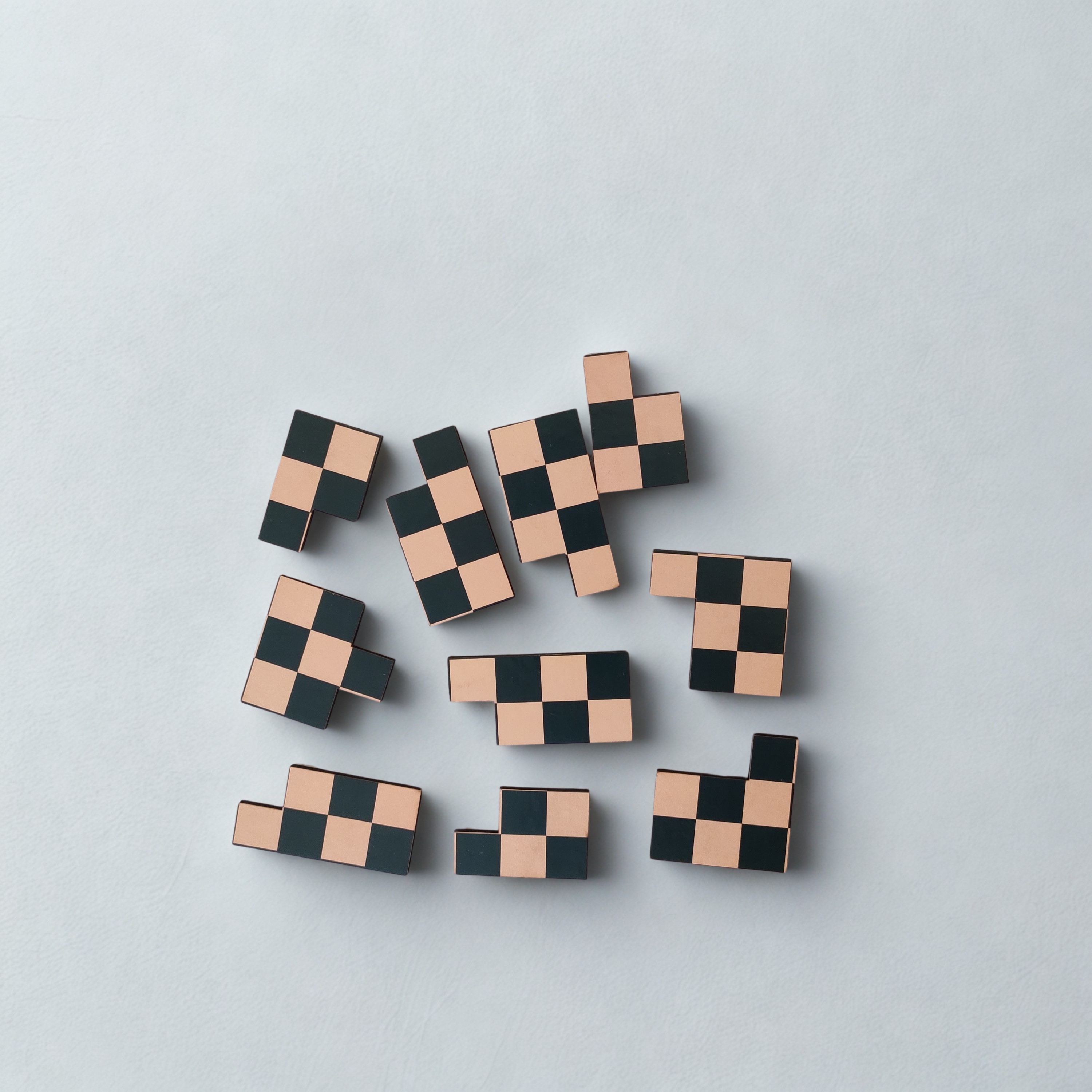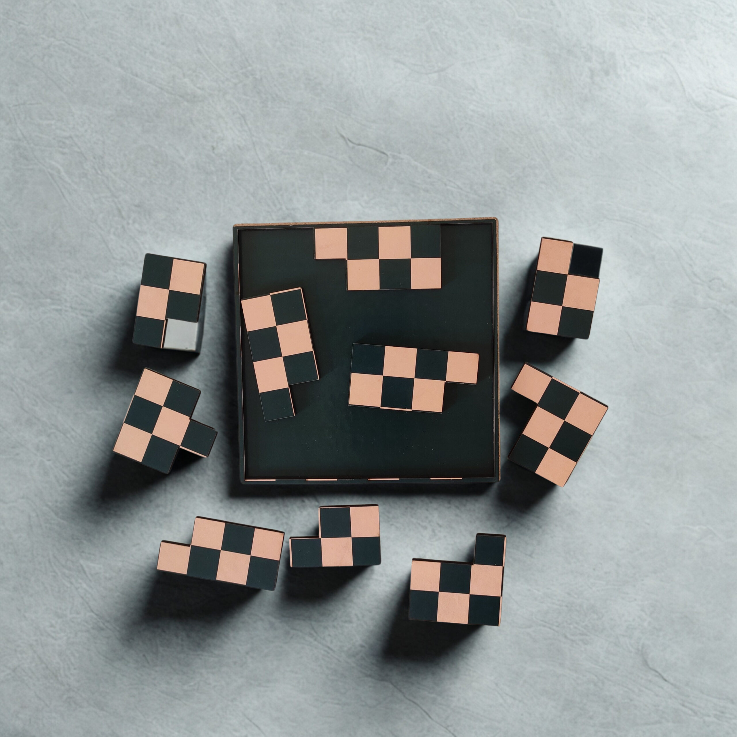This is a compact 5×5 inch puzzle made from strong laser-cut MDF wood. It comes with 10 checkered pieces and a base with a frame to keep everything neat and easy to play with.