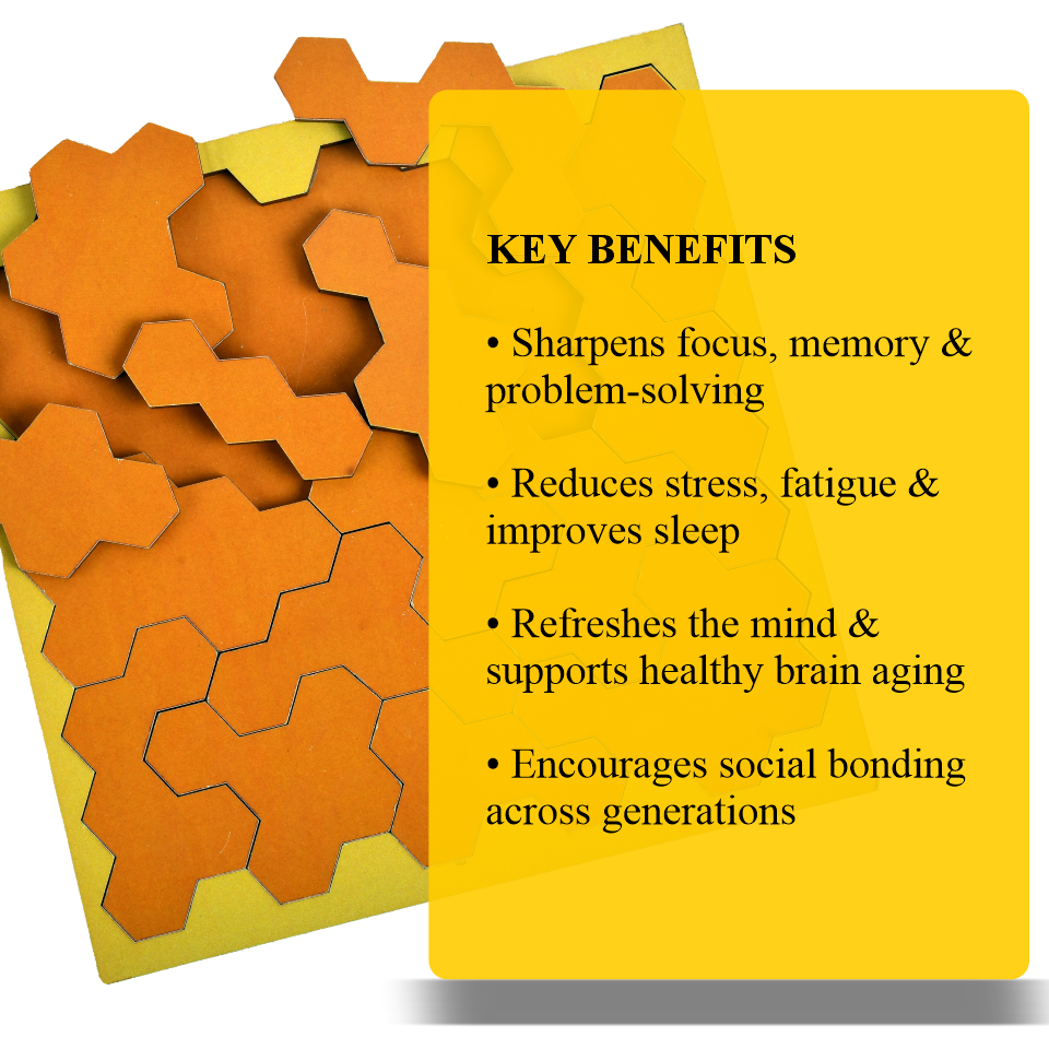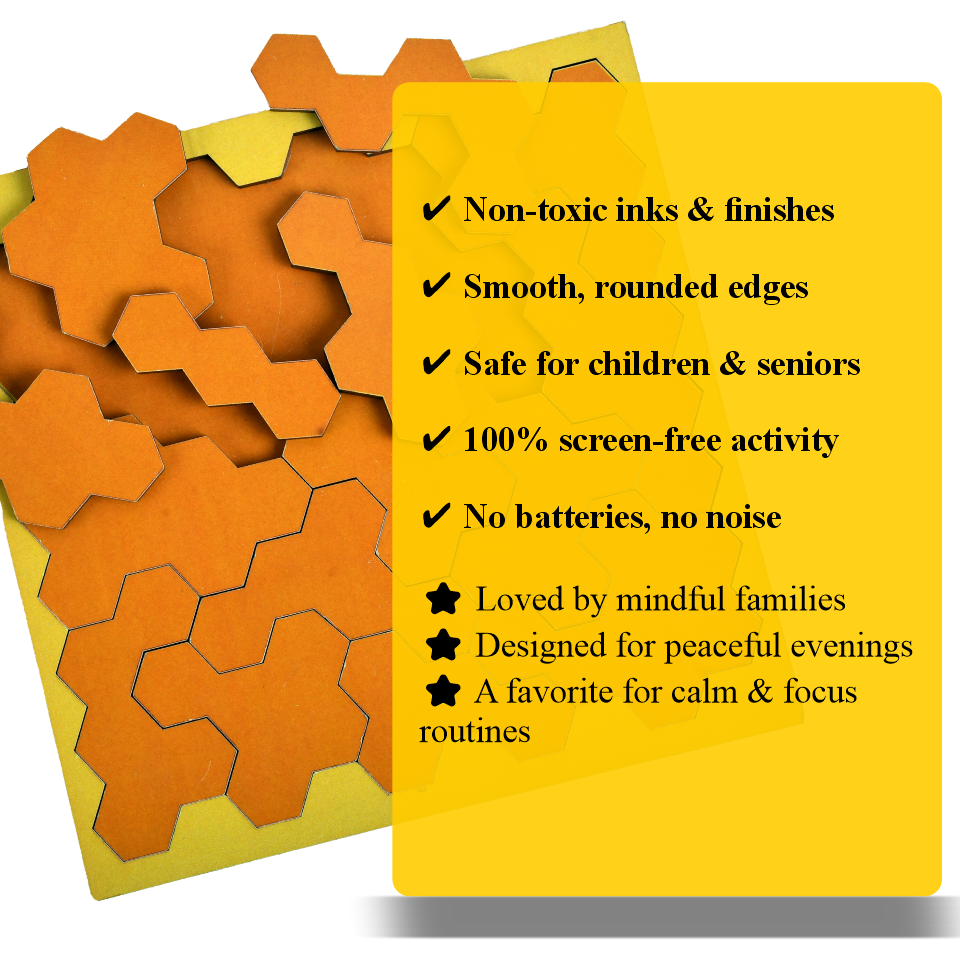 A refined geometric wooden puzzle inspired by honeycomb symmetry, designed for mindful adults seeking focus, balance, and quiet cognitive engagement.